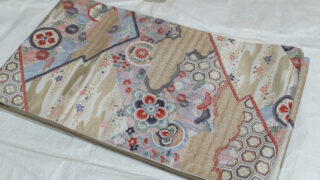 帯 【袋帯2種】オフホワイトに銀通し・正倉院文様&金通し・変わり織り・未使用帯 袋帯2点です。銀通しのオフホワイトにブルーブレーの蜀江柄の帯は、ユーズドですが、とても使い勝手の良さそうな色柄の帯です。未使用の金通しの帯は、タマムシ色のラメ感ある帯地に、墨流しの染地を貼ったようなちょっと変わったデザインになっています。 ... 2024.04.08 帯