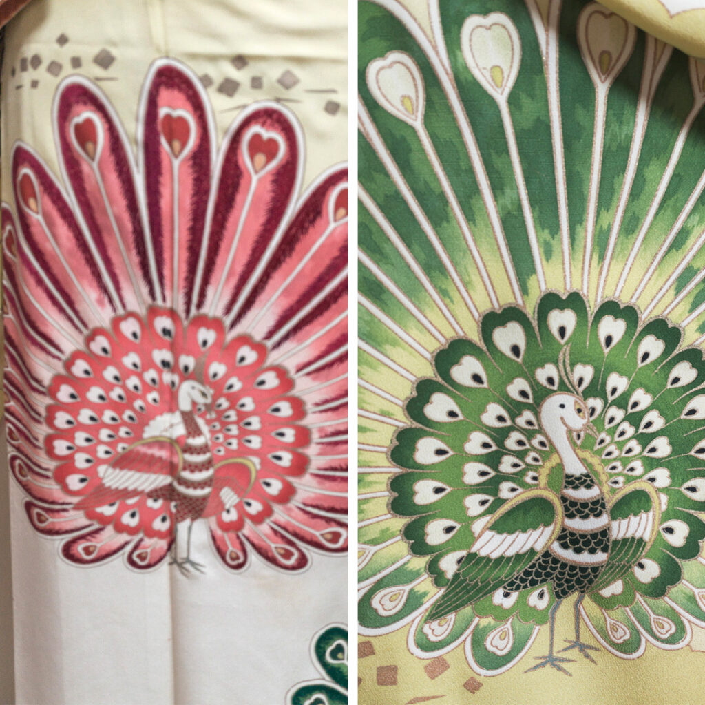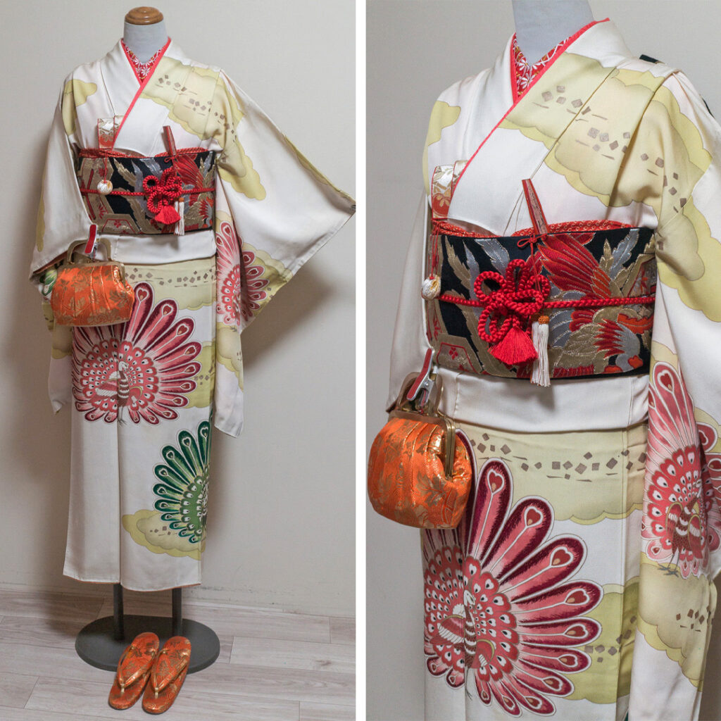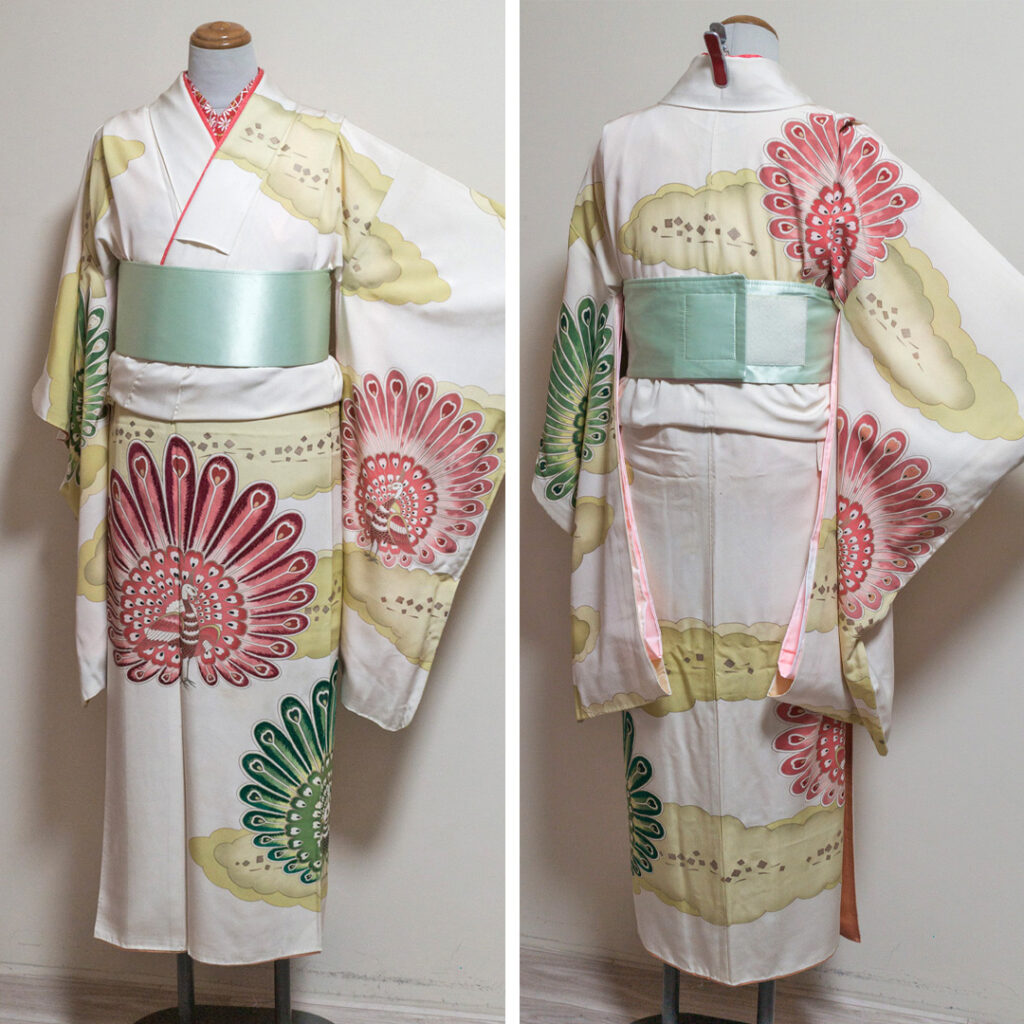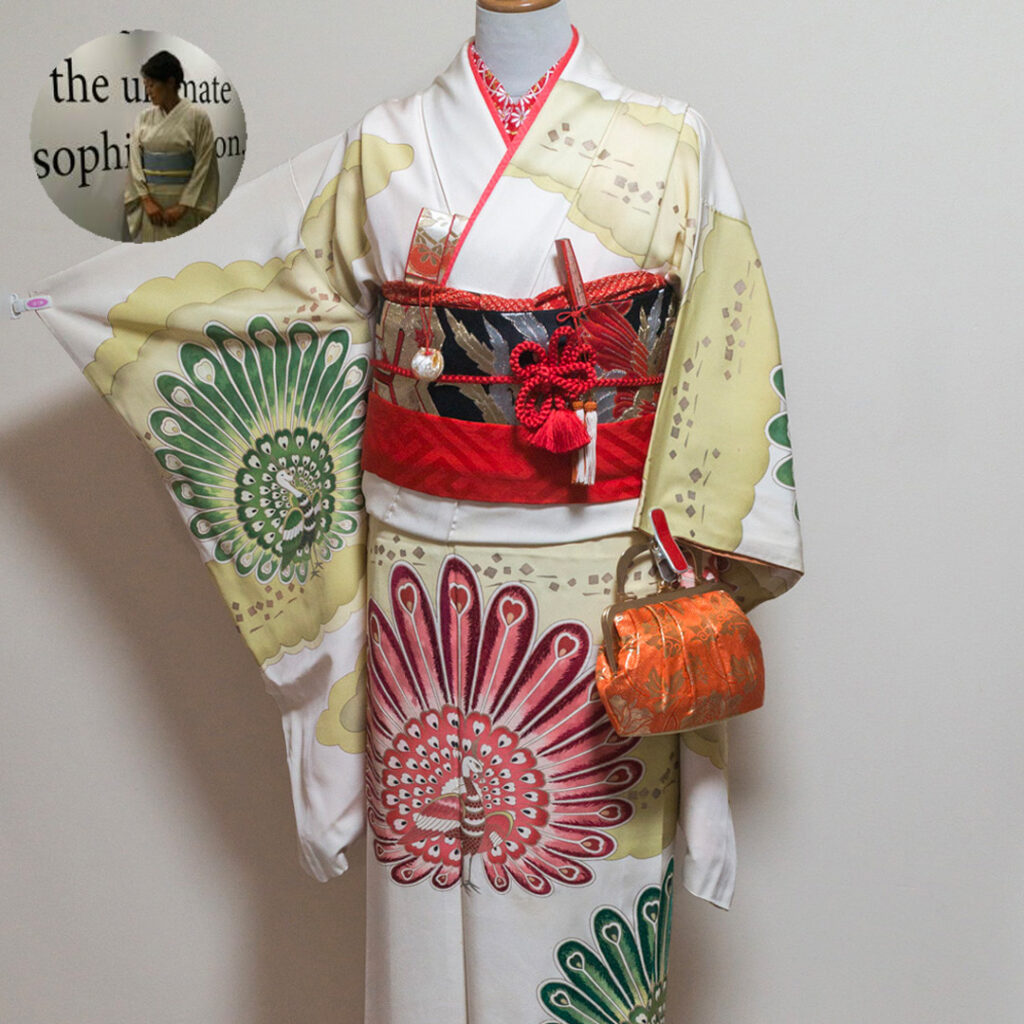 羽を広げた孔雀の柄がインパクト大! レトロな印象が目を惹く正絹小振袖セットです。