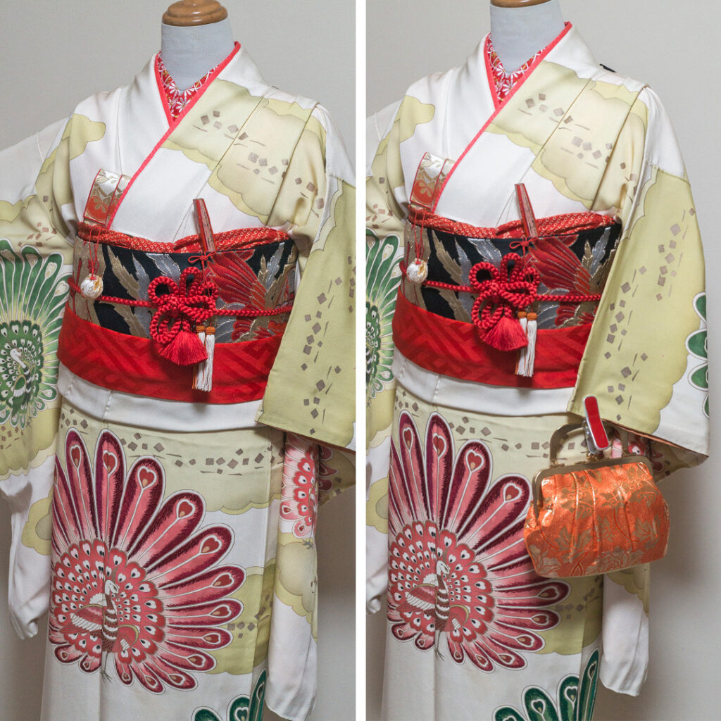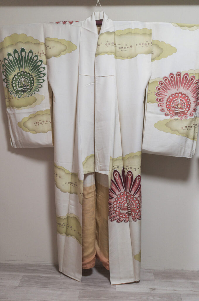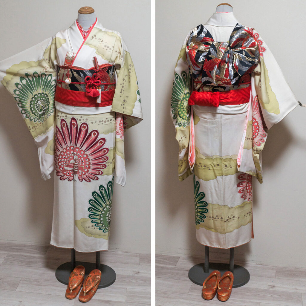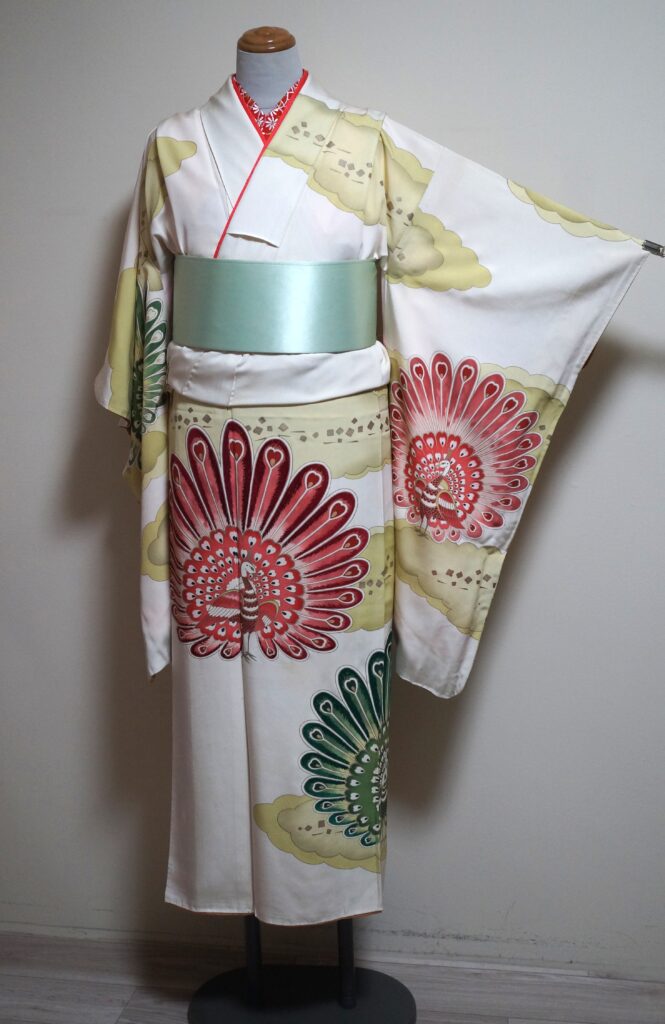 羽を広げた孔雀の柄がインパクト大! レトロな印象が目を惹く正絹小振袖セットです。