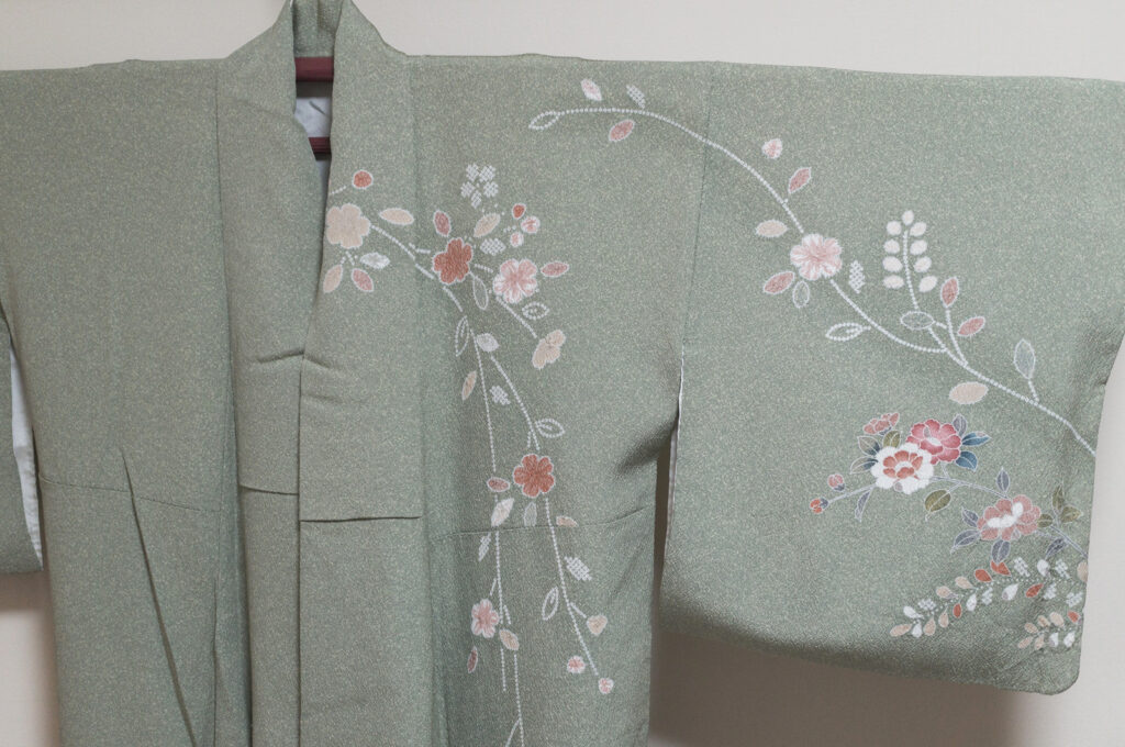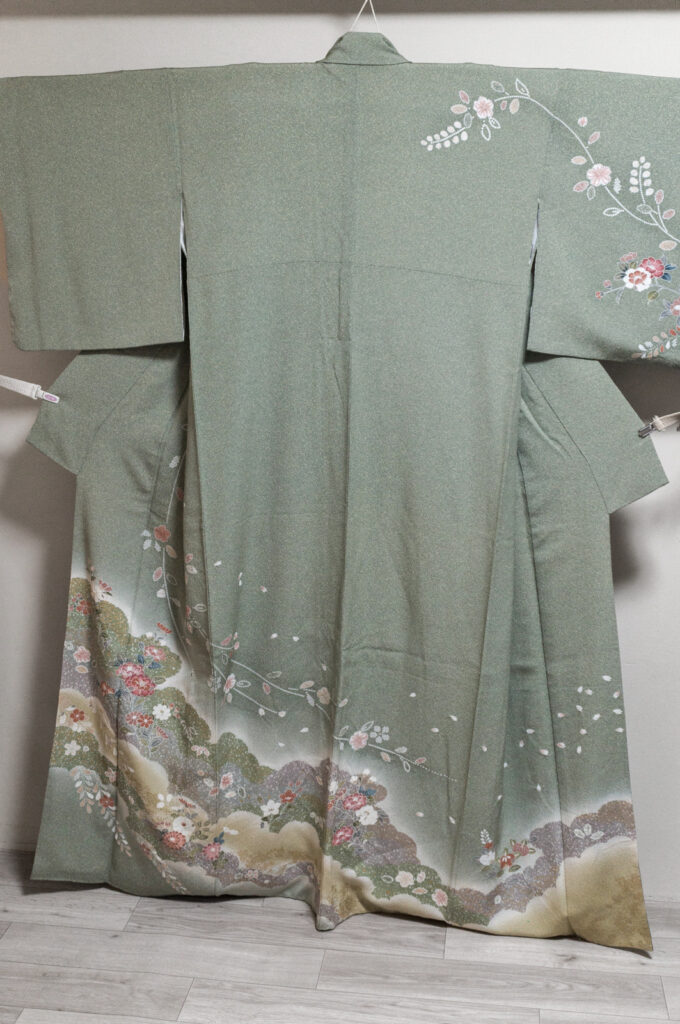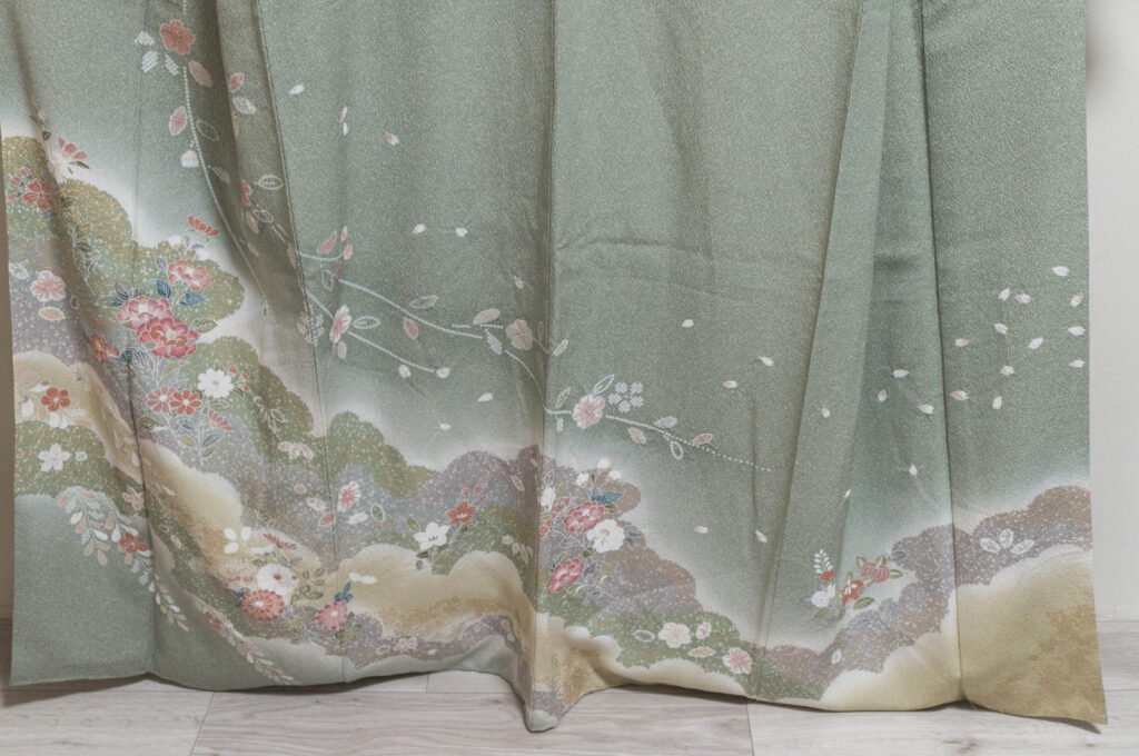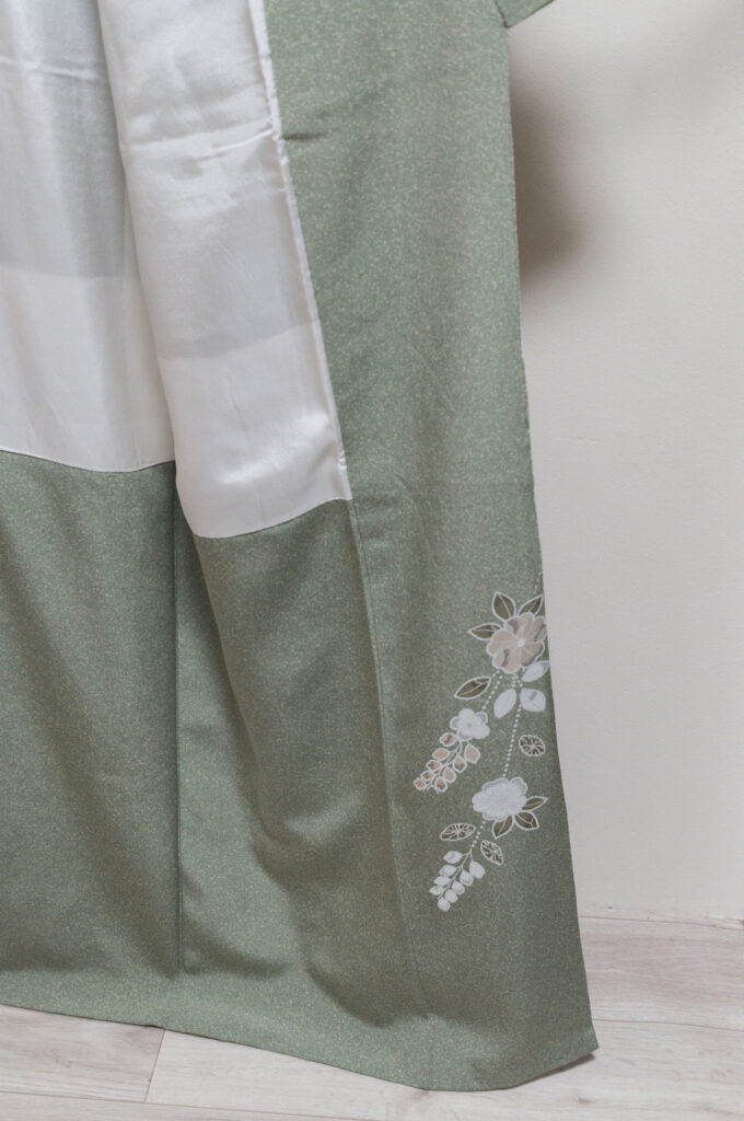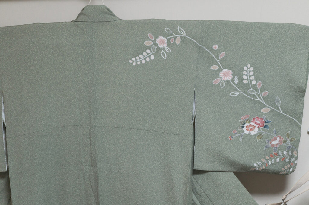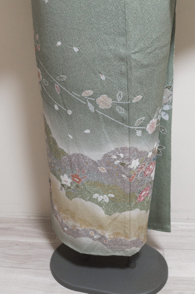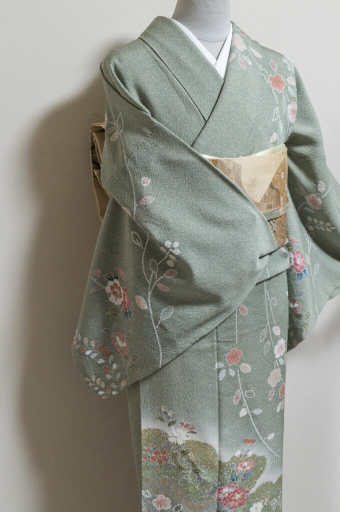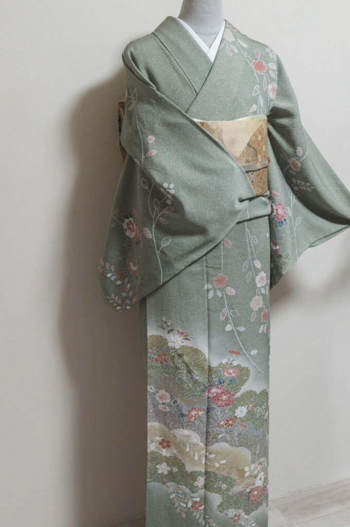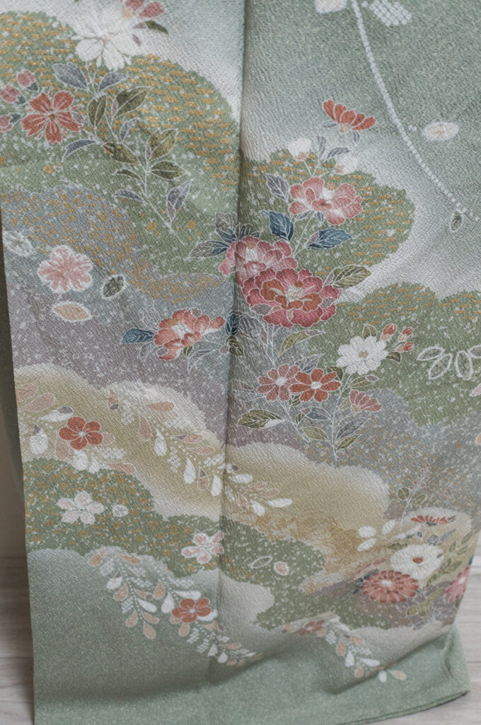 やわらかい緑色のたたき染めに、可憐な草花を部分絞りと用いて施した訪問着です。