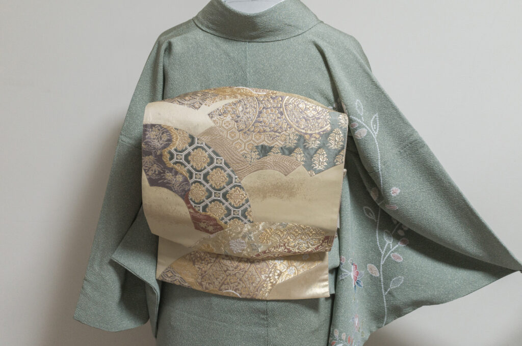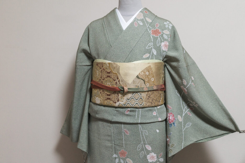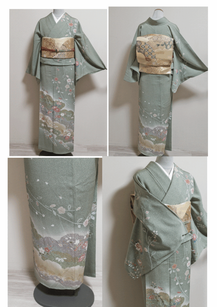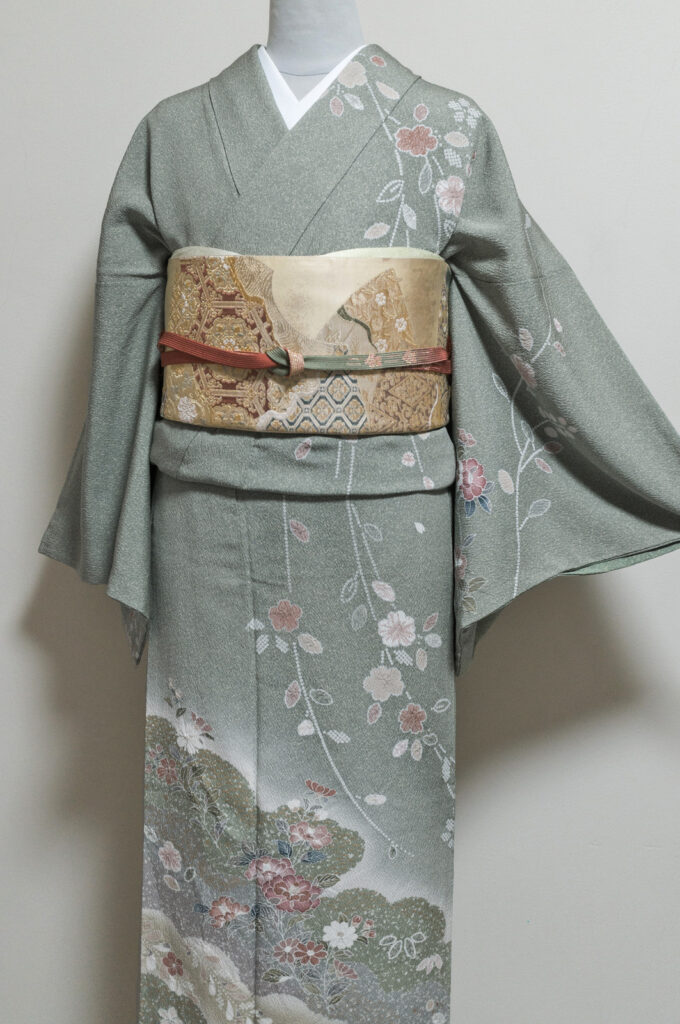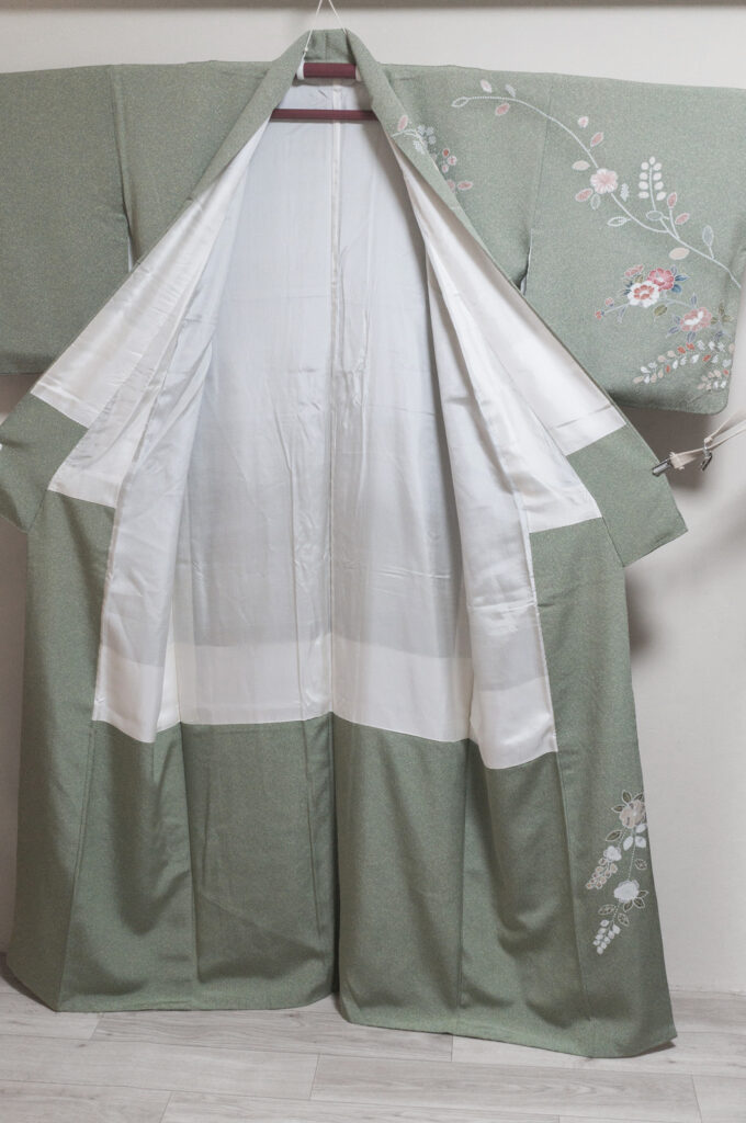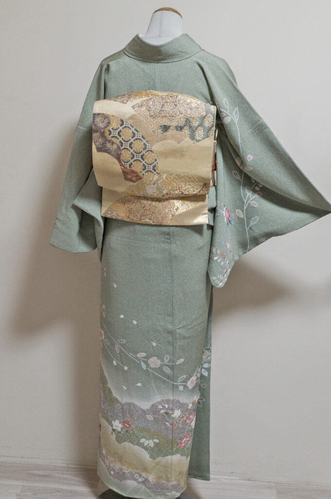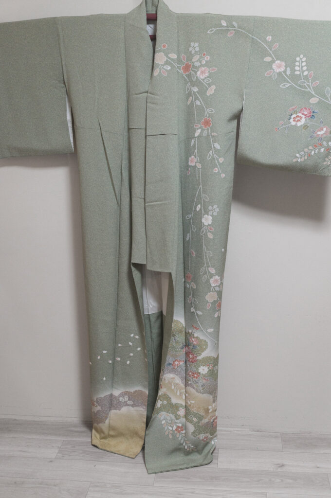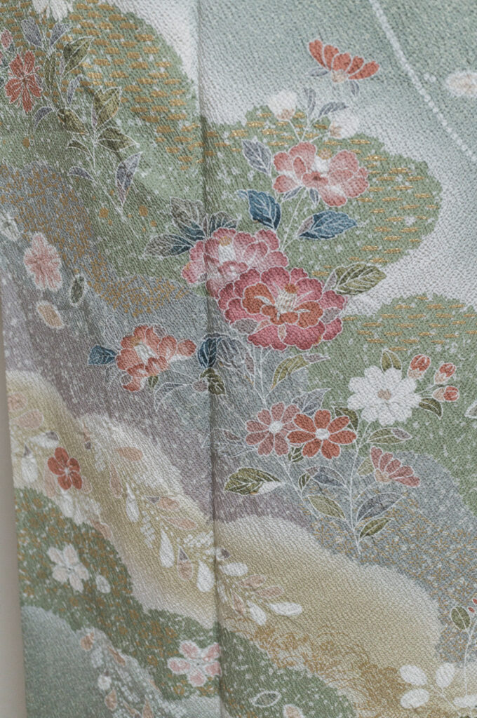 やわらかい緑色のたたき染めに、可憐な草花を部分絞りと用いて施した訪問着です。