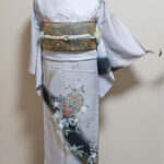 やわらかい緑色のたたき染めに、可憐な草花を部分絞りと用いて施した訪問着です。