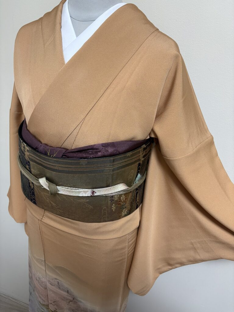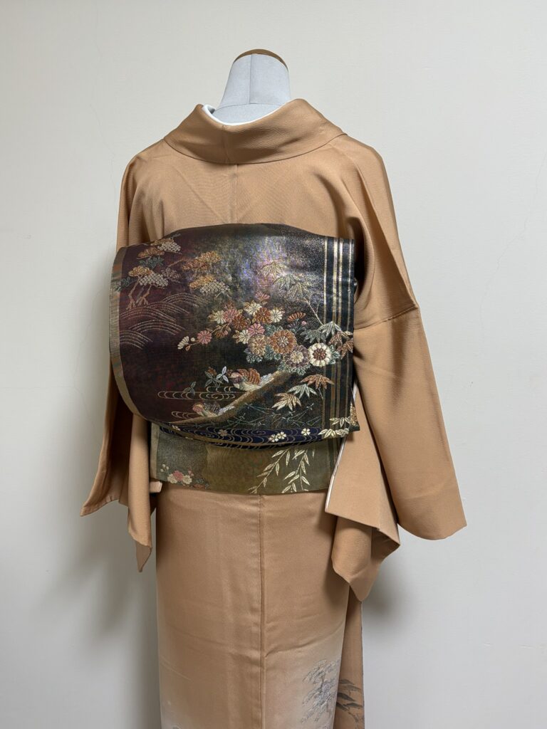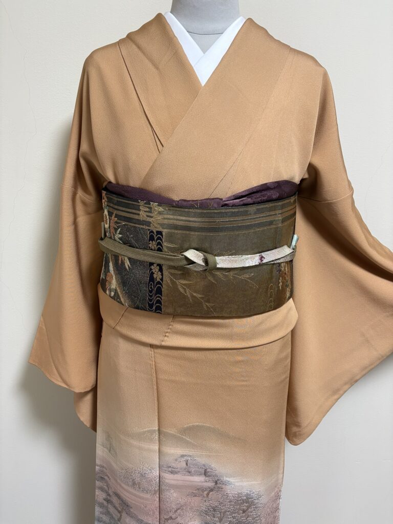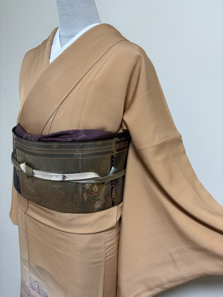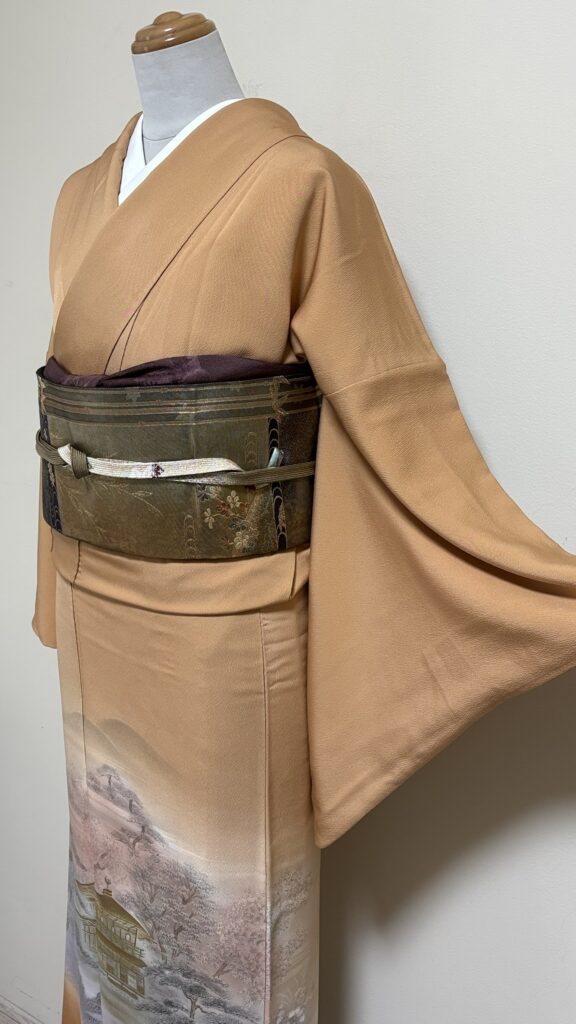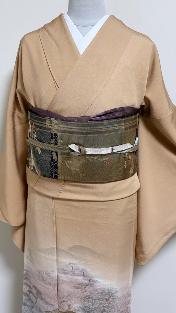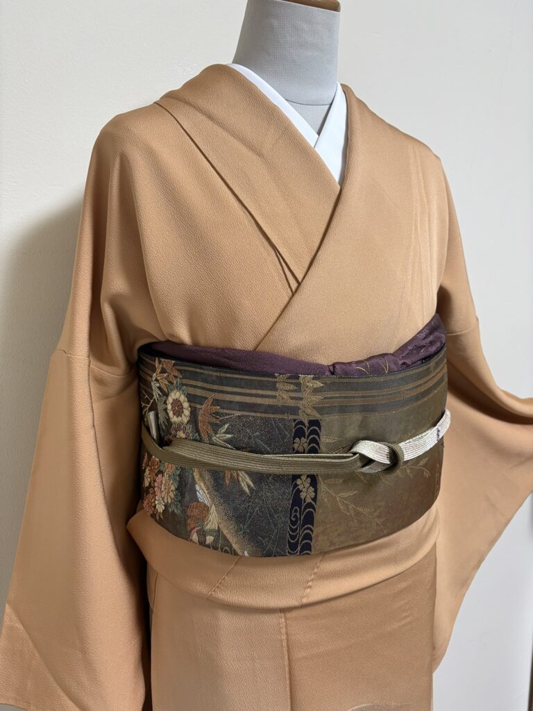 比翼を入れて、紋を付けると色留袖として使えますが、現状は紋無しですので、訪問着と同格になります。