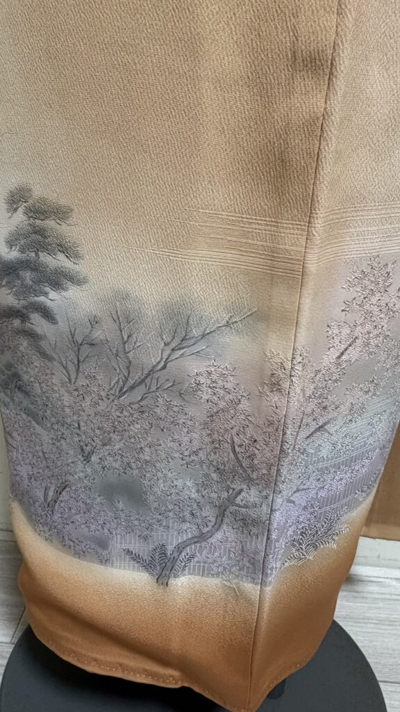 淡いピンクとパープルのぼかしカラーで、格調高いお着物です。