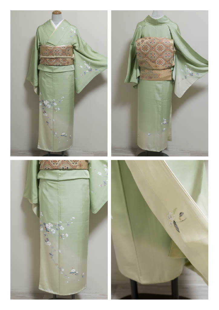 淡い緑色~クリーム色の美しい地色に、さりげなく木瓜の花を描いた訪問着です。