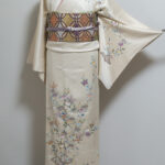 落ち着いたコーラルオレンジの地に、牡丹・梅・菊が部分刺繍を用いてデザインされた美しい付下げ着物です。