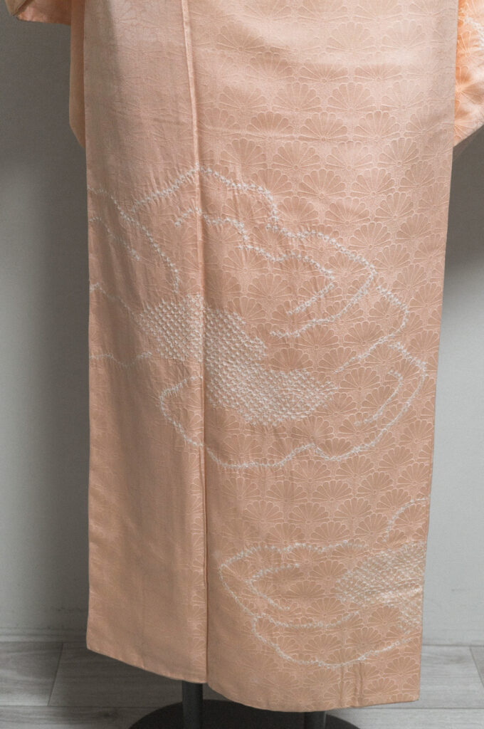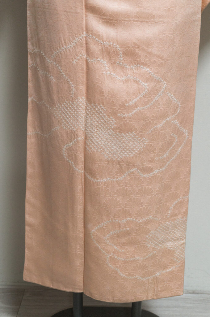 菊青海波の地紋が浮かび、上前や袖袂には部分的な絞りが入った上品な一枚。